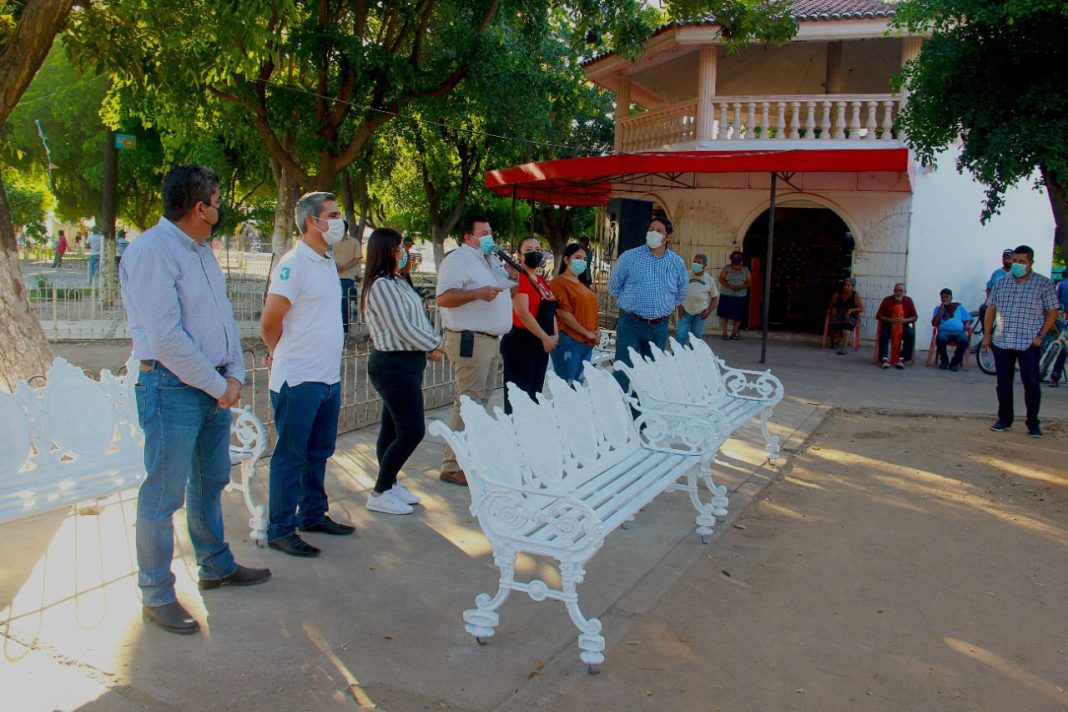 VILLA JUÁREZ, Sin.- Como parte del programa de embellecimiento de espacios públicos que puso en marcha el Ayuntamiento de Navolato, el presidente municipal Eliazar Gutiérrez Angulo, dio el banderazo de inicio de la colocación de 15 bancas metálicas en la plazuela de la sindicatura Benito Juárez, con una inversión de $127,500.