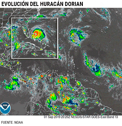 El Centro Nacional de Huracanes de Estados Unidos (NHC) informó sobre un aumento de la potencia de Dorian, actualmente de categoría 5, a medida que la pared del ojo del huracán se aproximaba a las islas Ábaco.