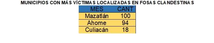 Los municipios con mayor incidencia en esta práctica durante el año 2019, son Mazatlán, Ahome y Culiacán, que en conjunto suman aproximadamente el 87% de las víctimas encontradas bajo esta condición.