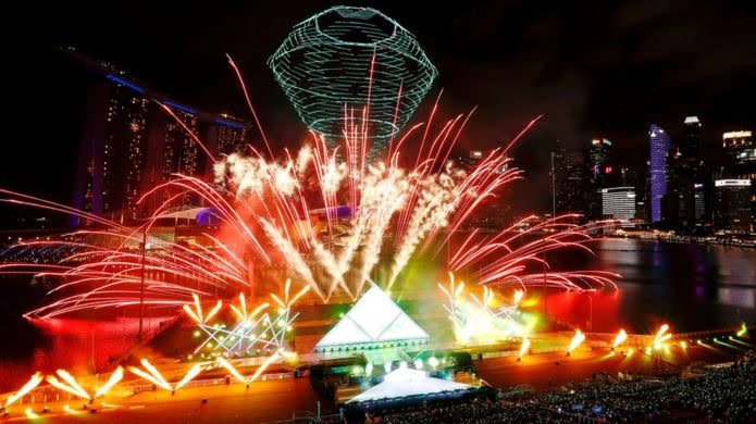 Marina Bay, en Singapur, fue sede de un vistoso espectáculo de fuegos artificiales.