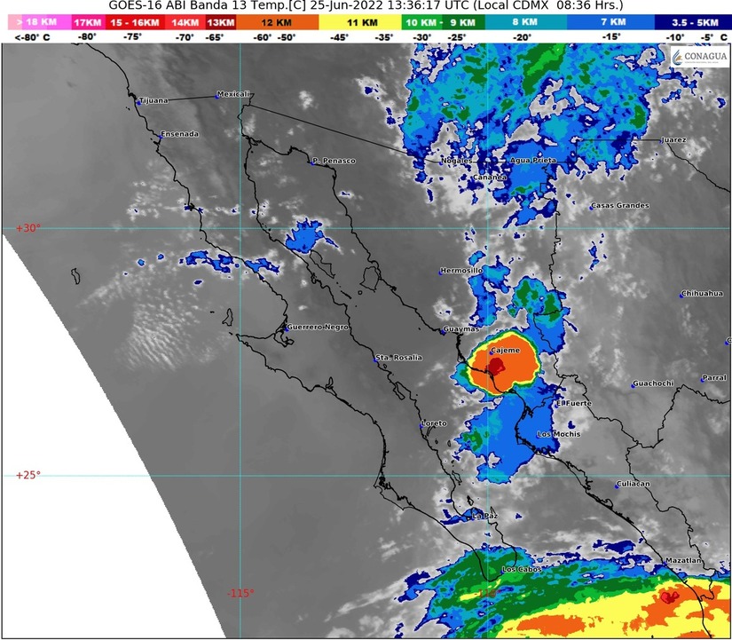 Sus extensas bandas nubosas propiciarán lluvias puntuales fuertes sobre entidades del occidente de la República Mexicana y refuerza la probabilidad de lluvias sobre el centro y sur del país.
