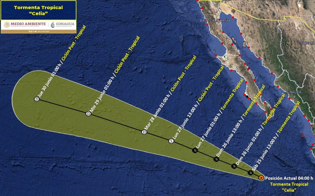 La tormenta tropical “Celia” se localiza al sur de la península de Baja California, se desplaza hacia el oeste-noroeste, alejándose de forma gradual de costas mexicanas.
