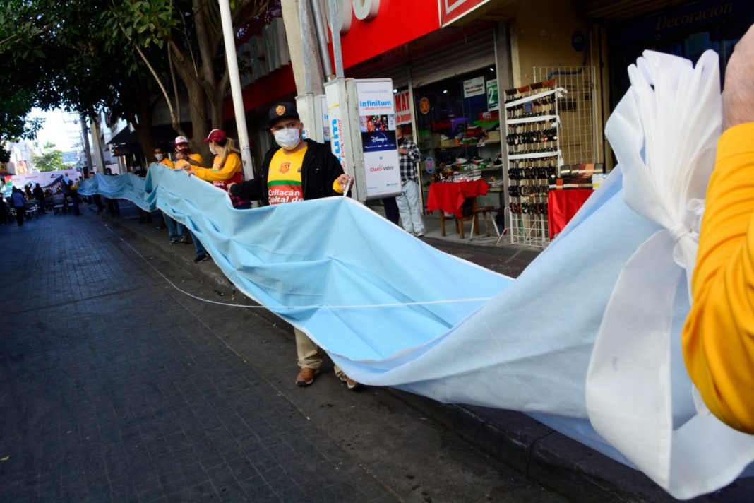CULIACÁN, Sin.- Con la instalación del cubrebocas más grande del mundo de 70 metros de largo, el Gobierno de Culiacán en coordinación con La Unión de Locatarios del Centro, la Cámara Nacional de Comercio y representantes del gobierno del estado instauraron de manera oficial el Día del Comerciante.