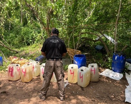 De acuerdo con la investigación, elementos de la SEDENA ubicaron un predio en las inmediaciones del poblado Alaya, Cósala, Sinaloa, utilizado para la probable elaboración de drogas sintéticas e hicieron entrega del sitio a la Policía Federal Ministerial (PFM) y personal de Servicios Periciales de esta institución, para realizar labores de inspección, procesamiento e investigación.