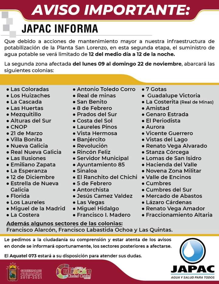 CULIACÁN, Sin.- A partir de este lunes 09 de noviembre el servicio de agua potable estará limitado de 12 de medio día, a 12 de la noche.