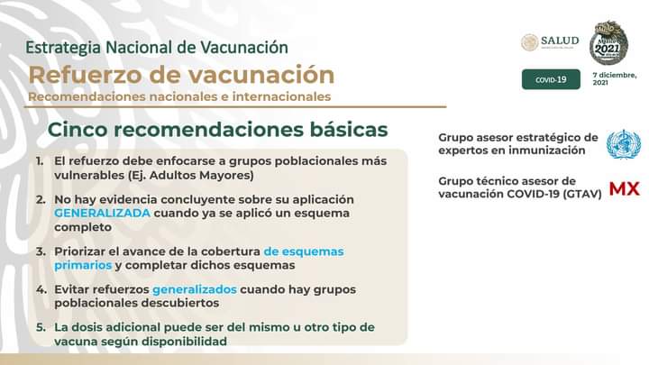 CIUDAD DE MÉXICO.- Hoy inicia en Chiapas, Ciudad de México, Jalisco, Oaxaca, Sinaloa y Yucatán la vacunación de refuerzo contra COVID-19 a personas adultas mayores de 60 años. Esta decisión se toma con base en las recomendaciones técnicas de la World Health Organization (WHO).