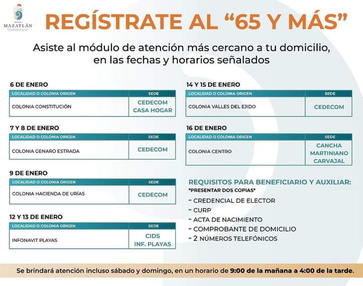 MAZATLÁN,  Sin.- Este jueves 6 de enero, inicia en el municipio la inscripción al Programa de Pensión para el Bienestar de las Personas Adultas Mayores, conocido también como “65 y Más”, con seis módulos en varias zonas de la ciudad que brindarán atención en fechas y horarios establecidos.