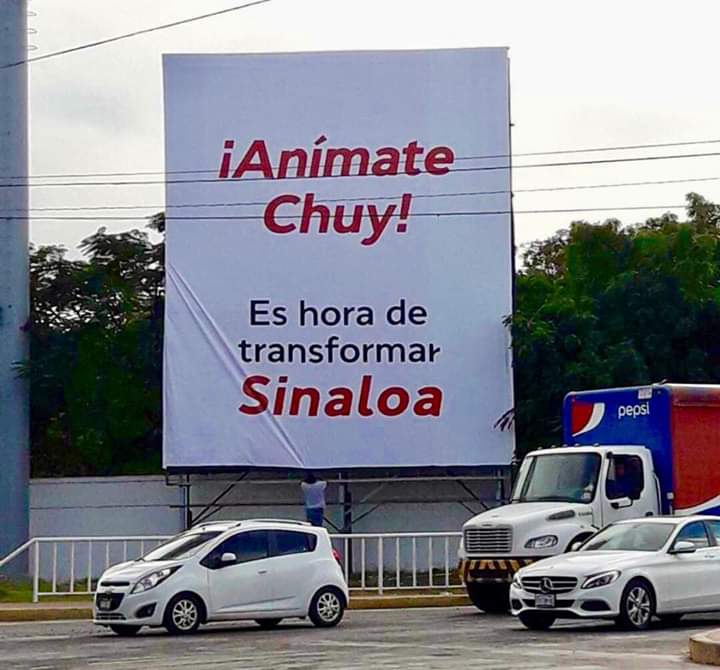 Esta manta es colocada a 48 horas de que apareciera una en color rojo sobre el bulevar Pedro Infante con la leyenda de “Anímate Chuy, es hora de transformar Sinaloa.