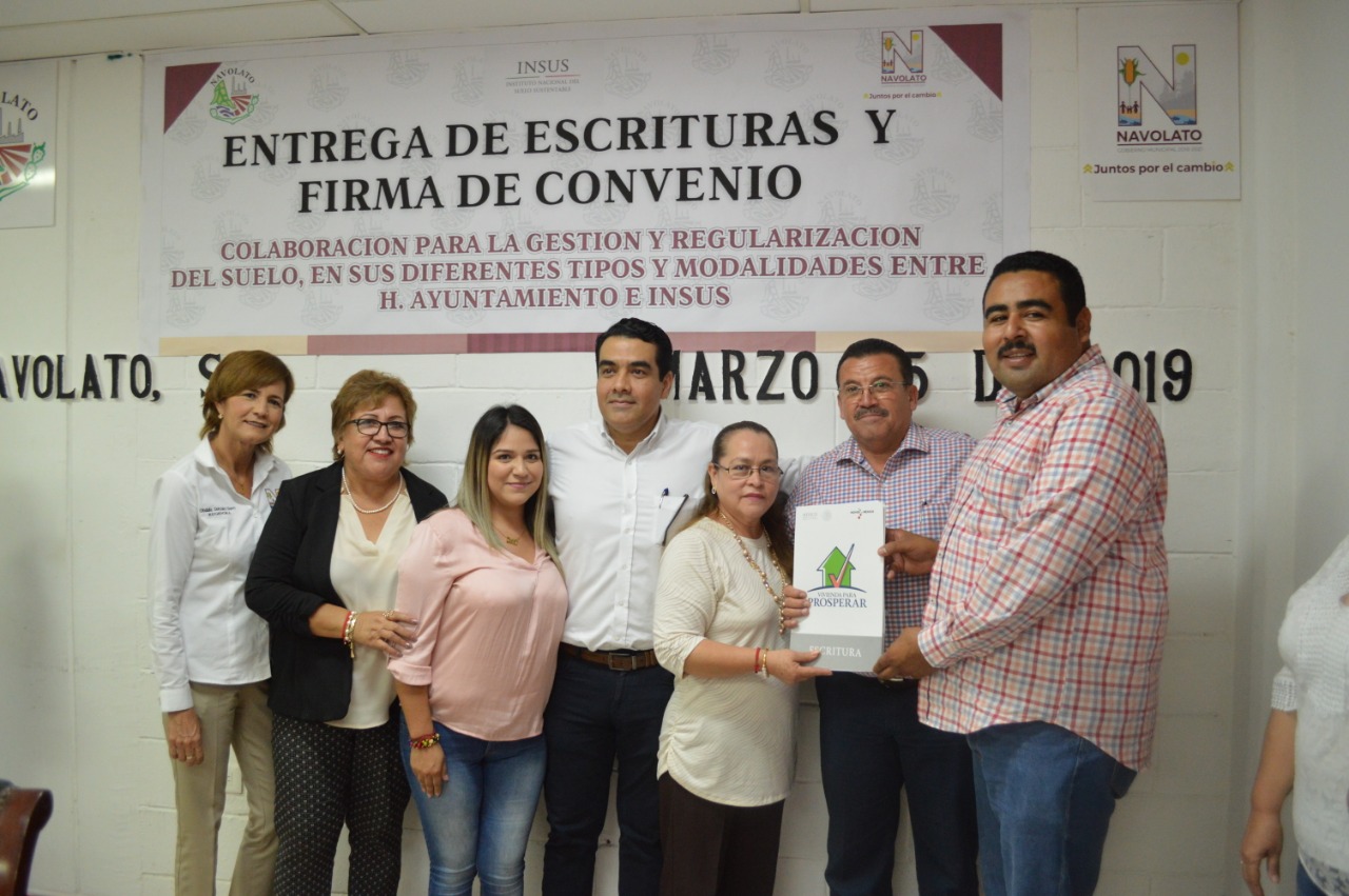 NAVOLATO, Sin.- Durante una firma de convenio de colaboración entre el Ayuntamiento de Navolato y el Instituto Nacional de Suelo Sustentable, varias familias de las sindicaturas Ángel Flores, San Pedro y la cabecera municipal cumplieron un sueño que anhelaban desde hace muchos años; les entregaron los títulos de propiedad de sus terrenos, y con ello obtuvieron la seguridad de las viviendas en las que viven porque ya cuentan con sus escrituras.