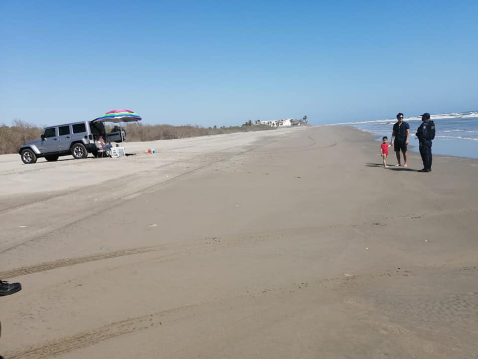 Una familia y un par de adultos mayores, entre los desalojados este viernes en las playas de Isla Cortés. Así los posteó la secretaría de Seguridad Pública con recorridos de la policía estatal por las playas de Altata.