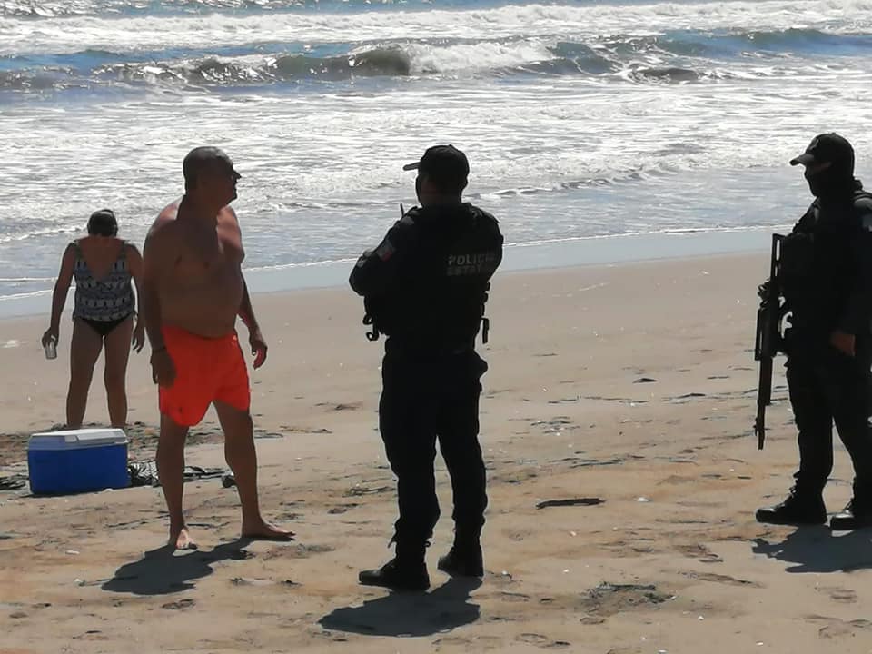 Una familia y un par de adultos mayores, entre los desalojados este viernes en las playas de Isla Cortés. Así los posteó la secretaría de Seguridad Pública con recorridos de la policía estatal por las playas de Altata.