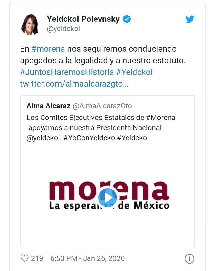 En un video publicado vía Twitter los representantes indicaron que “en apego a nuestros estatutos, los comités ejecutivos estatales de Morena respaldamos a nuestra presidenta nacional Yeidckol Polevnsky.., Al margen de la ley nada por encima de la ley nadie”.