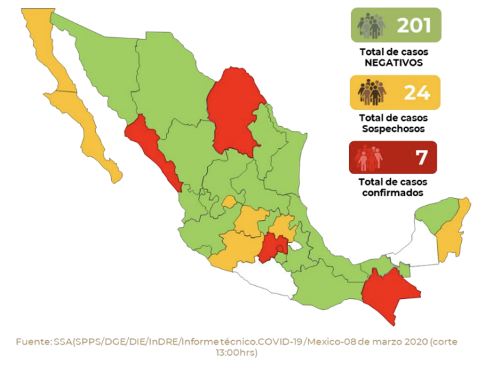 CIUDAD DE MÉXICO.- La Secretaría de Salud (SSA) informó que se mantiene en siete la cifra de casos positivos por Covid-19 en México y se estudian 24 más sospechosos en siete entidades del país.