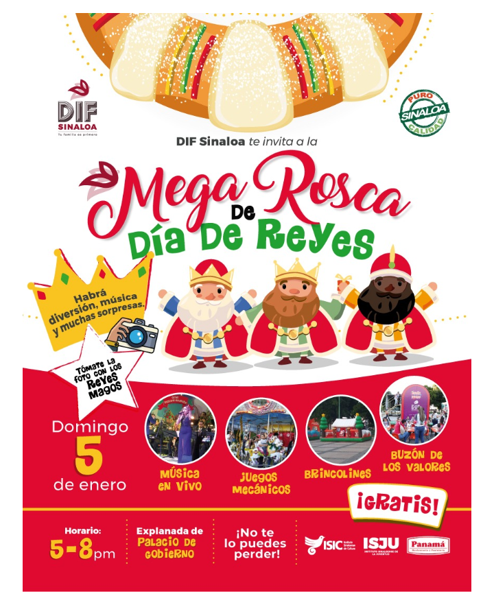 CULIACÁN, Sin.- Para festejar el Día de Reyes, el Sistema DIF Sinaloa presidido por Rosy Fuentes de Ordaz, invita a las familias sinaloenses a disfrutar de la tradicional Mega Rosca el próximo domingo 5 de enero.