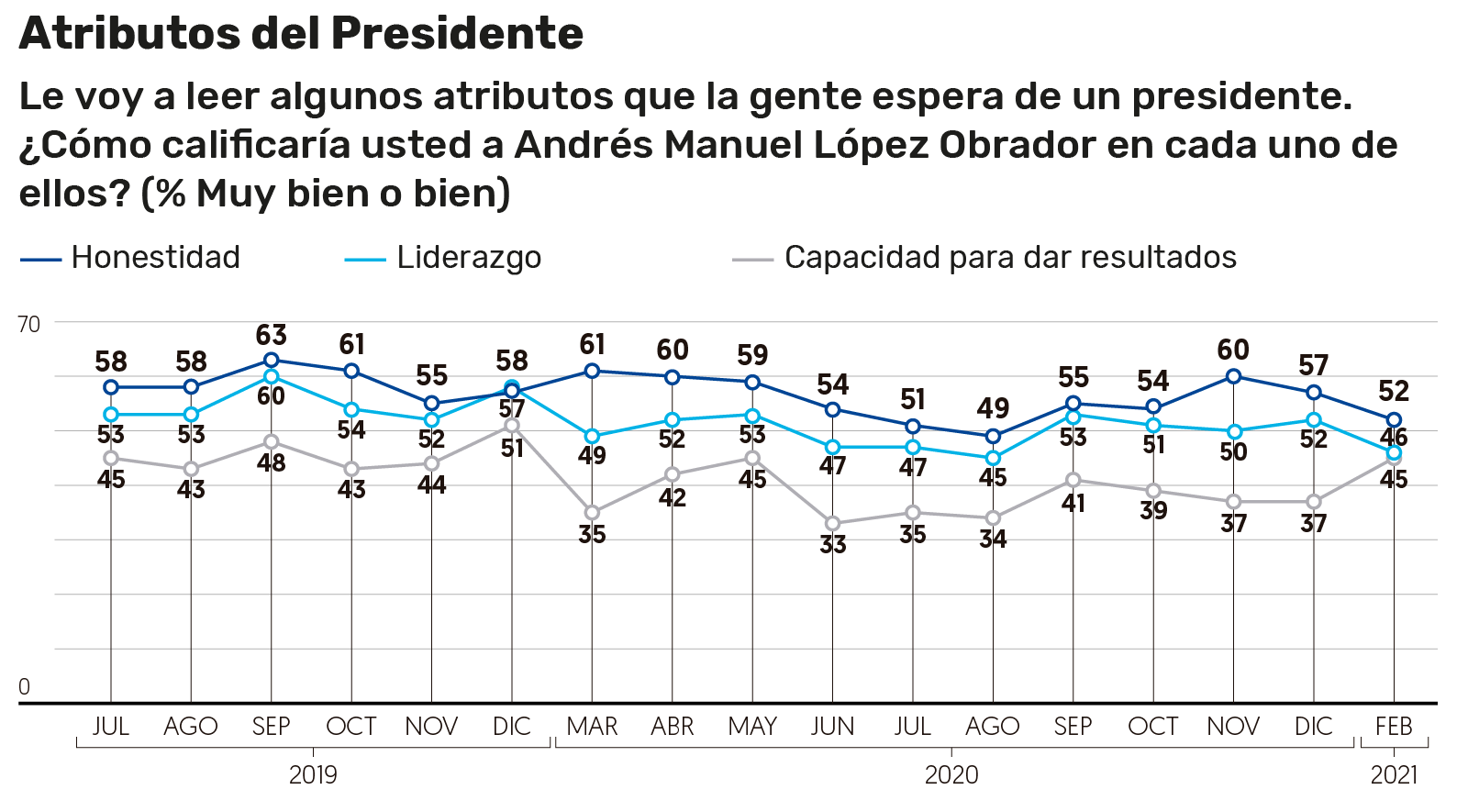 En contraste, la imagen de honestidad y de liderazgo mostró bajas, de 57 a 52 por ciento lo primero, y de 52 a 46 por ciento lo segundo.