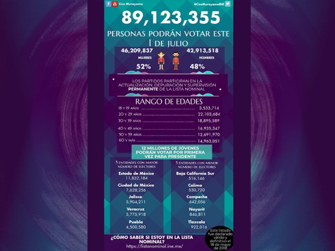 En su cuenta de Twitter @CiroMurayamaINE, el consejero del Instituto Nacional Electoral (INE) Ciro Murayama Rendón difundió: “Checa la composición por edades del padrón electoral @INEMexico y el fuerte peso de la juventud. Además,12 millones de jóvenes podrán votar por vez primera en una elección presidencial. Vota libre”.
