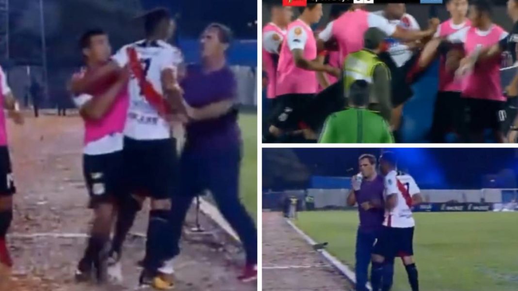 El jugador cuando salió del campo se fue directamente hacia su su técnico y con un empujón le reclamó la razón de su salida, en ese momento llegaron varios de sus compañeros quienes trataron de alejarlo y calmarlo.