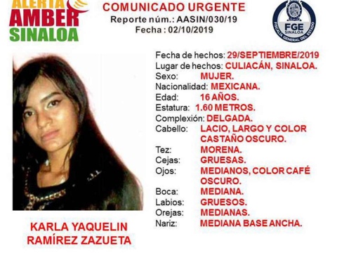 CULIACÁN, Sin.- Se activó la Alerta Amber para localizar a Karla Yaquelin Ramírez Zazueta, de 16 años, desaparecida en Culiacán.