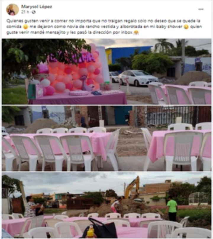 Durante el día sábado la futura madre, identificada como Marysol López, a través de su cuenta de Facebook invitó a todos sus vecinos y contactos en Mazatlán, Sinaloa, a su fiesta de baby shower.