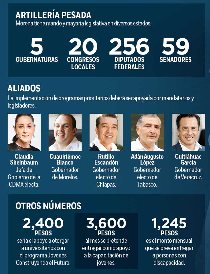 CIUDAD DE MÉXICO.- Con cinco gobernadores, mayoría en 20 congresos locales, 256 diputados federales y 59 senadores arrancará su gobierno federal el presidente Andrés Manuel López Obrador. El respaldo de los mandatarios estatales y diputados locales será de vital importancia para la implementación de los programas prioritarios y la aprobación de reformas constitucionales que darán paso a la Cuarta Transformación.