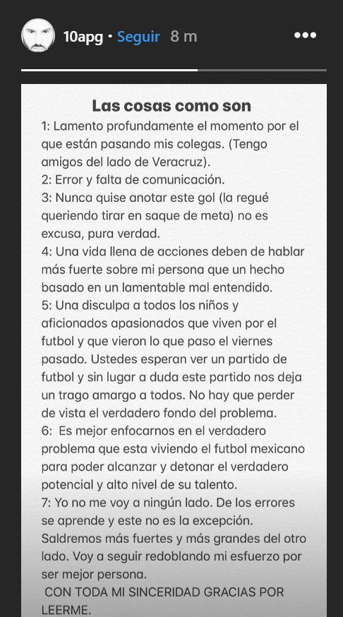“Lamento profundamente el momento por el que están pasando mis colegas (tengo amigos del lado de Veracruz). Error y falta de comunicación. Nunca quise anotar ese gol (la regué queriendo tirar en saque de meta), no es excusa, pura verdad.