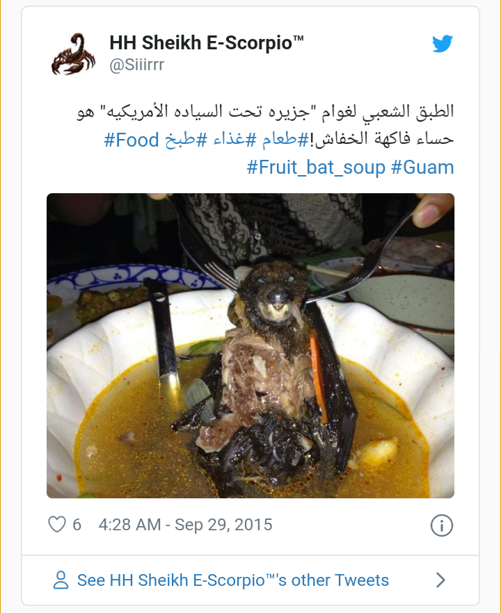 La famosa sopa también conocida como “Fruit bat soup”, es un platillo preparado en la región con un murciélago cocido abierto y acompañado con fruta o leche de coco, muchos comparan su sabor con el del “caldo de gallina”.