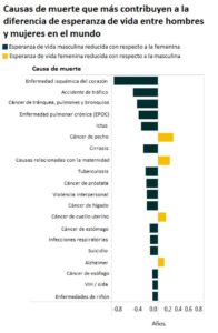 MADRID, España.- Infarto, cáncer de pulmón, accidentes de tráfico, suicidios, ictus, cirrosis, tuberculosis, VIH, homicidios… De las 40 principales causas de muerte en el mundo, 33 reducen más la vida de los hombres que de las mujeres. El resultado es que una niña nacida hoy vivirá 74,2 años de promedio, 4,4 más que un varón.