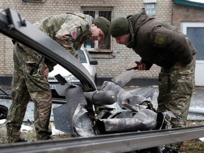 Agentes de policía inspeccionan los restos de un misil que cayó en la calle en Kyiv, Ucrania, el 24 de febrero.