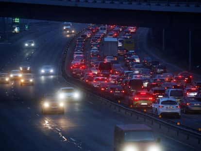 Se ve una larga fila de autos saliendo de Kyiv el 24 de febrero. El tráfico pesado parecía dirigirse hacia el oeste, lejos de donde se escucharon explosiones temprano en la mañana.