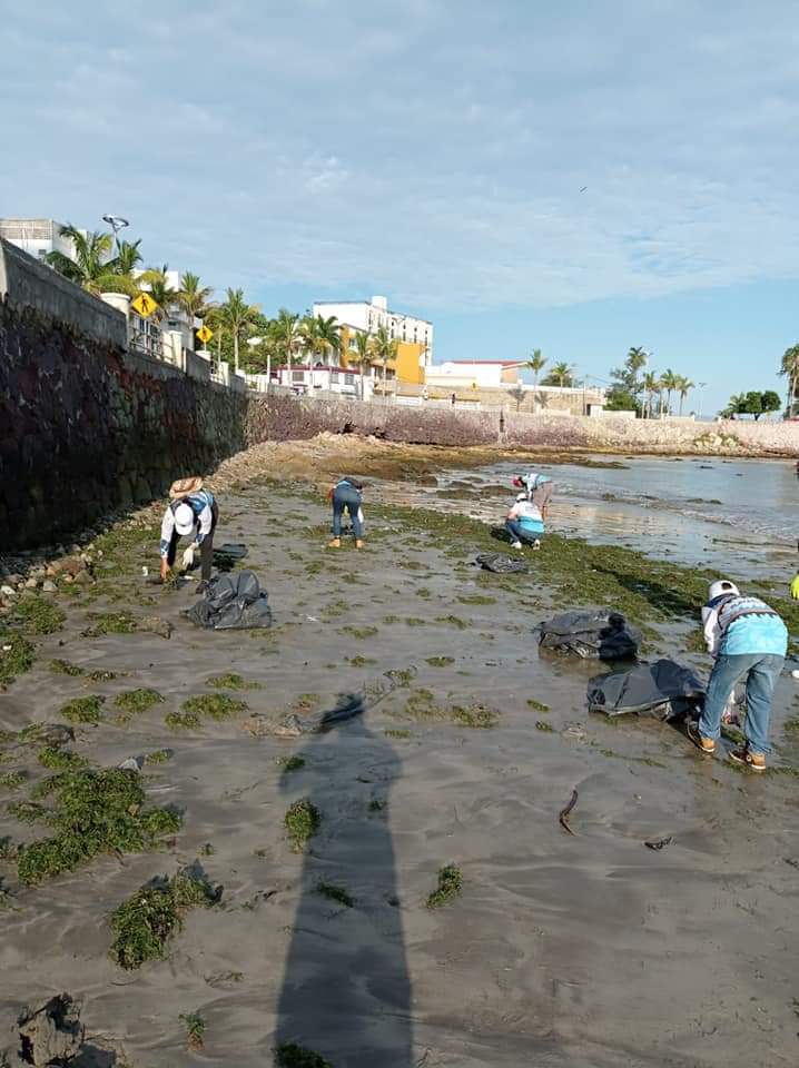 MAZATLÁN, Sin.- El personal administrativo de Operadora y administradora de Playas apoyaron al personal operativo fijo de limpieza de Playas en Playa Norte en el puerto.