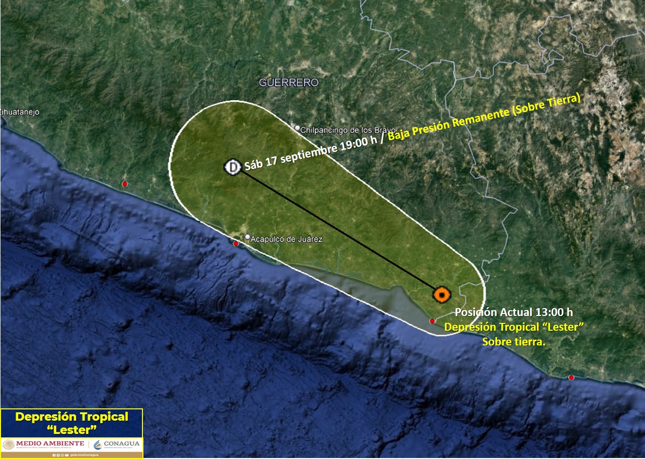 CIUDAD DE MÉXICO.- A las 13:00 horas, tiempo del centro de México, Lester entró a tierra como depresión tropical en las inmediaciones del municipio de Punta Maldonado, Guerrero.