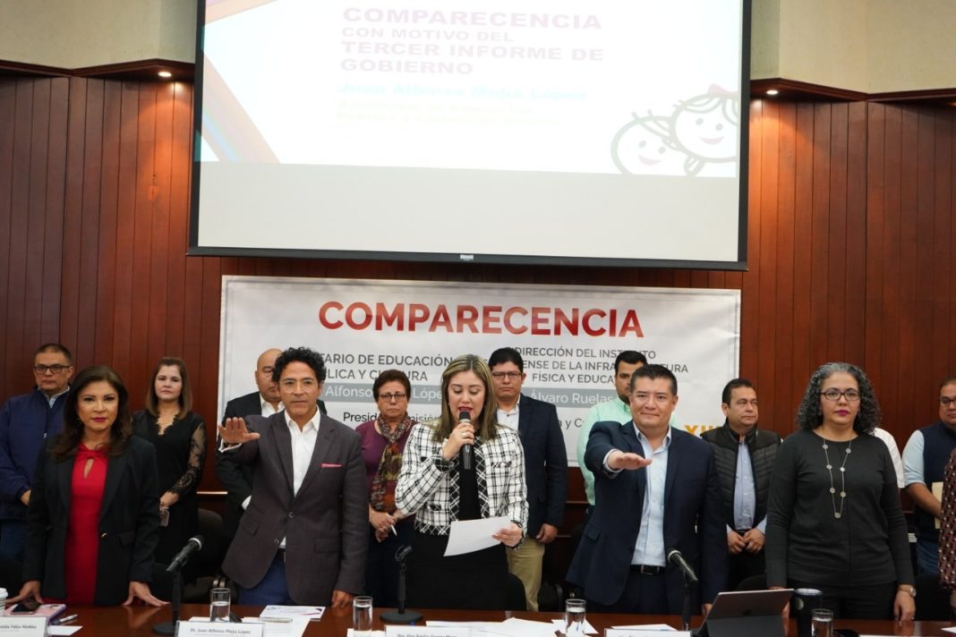 La comparecencia fue presidida por la presidenta de la Junta de Coordinación Política, Graciela Domínguez Nava, y la presidenta de la Mesa Directiva, Gloria Himelda Félix Niebla, y fue moderada por la presidenta de la Comisión de Educación Pública y Cultura, Flor Emilia Guerra Mena.