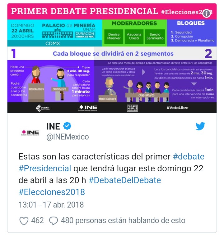 La Comisión a cargo del consejero Benito Nacif sorteó el número que le corresponde a cada aspirante a la Presidencia de la República para el debate del 22 de abril. Margarita Zavala será la candidata número 1; José Antonio Meade, el 2; Ricardo Anaya, el 3; Andrés Manuel López Obrador, el 4; y Jaime Rodríguez Calderón, el 5.