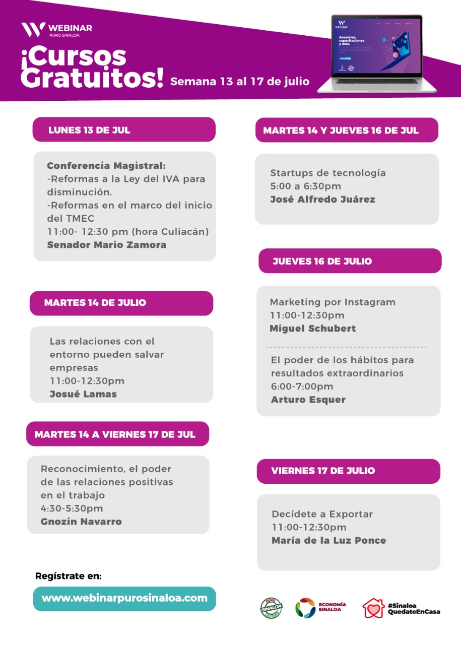 CULIACÁN, Sin.- La Secretaría de Economía en Sinaloa presentó la línea de cursos gratuitos que otorgará la semana próxima a través de la plataforma webinarsinaloa.com.