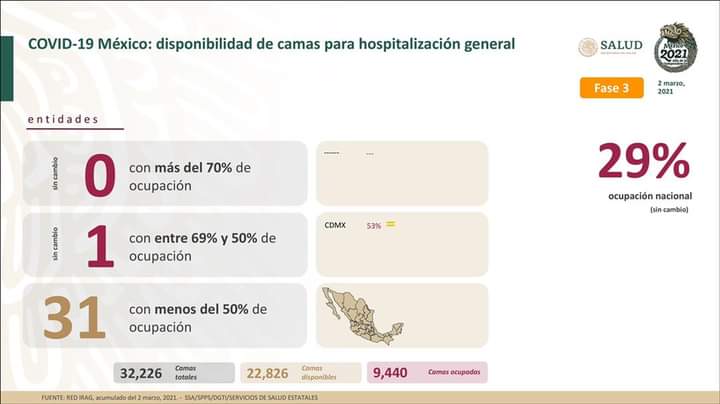A nivel nacional, 71% de camas de hospitalización general están disponibles y 29% ocupadas. En camas con ventiladores, 68% están disponibles y 32% ocupadas.