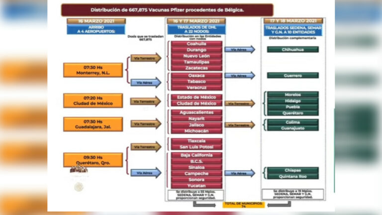 CIUDAD DE MÉXICO.- México recibió, este martes 16 de marzo, 667 mil 875 dosis de la vacuna desarrollada por el laboratorio Pfizer a través de 4 vuelos que aterrizaron en las ciudades de México, Monterrey, Guadalajara y Querétaro.