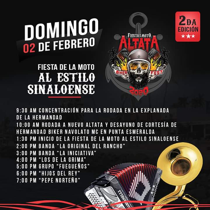 Se trasladarán a Altata donde será la inauguración oficial e iniciará la fiesta en grande con música en vivo, y el domingo se llevará a cabo otra rodada a Nuevo Altata y cerrarán con una fiesta al estilo sinaloense con grupos norteños y banda.