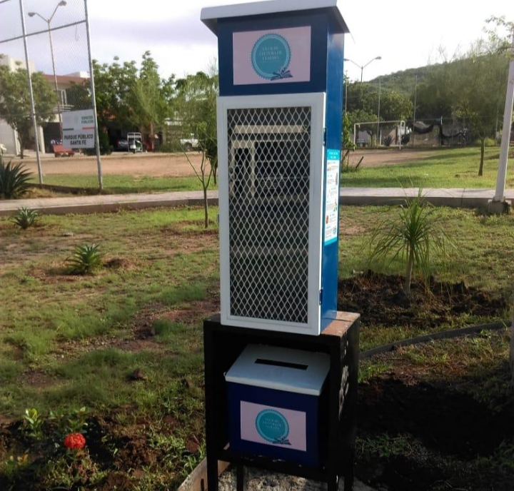 Tras la colocación de un primer librero público con apoyo de ciudadanos locales en Parque Jardines de Santa Fe 4, la impulsora del proyecto, Claudia Judith Lizárraga Garza, invita a la donación de ejemplares.