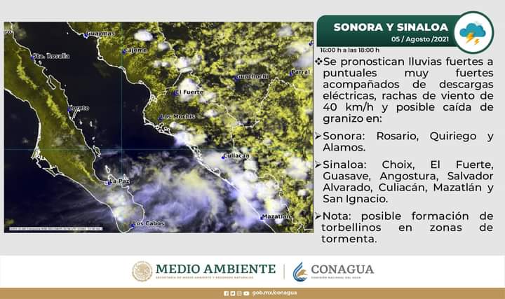 CULIACÁN, Sin.- Para la tarde de este jueves se esperan lluvias fuertes en Choix, El Fuerte, Guasave, Angostura, Salvador Alvarado, Culiacán, Mazatlán y San Ignacio.