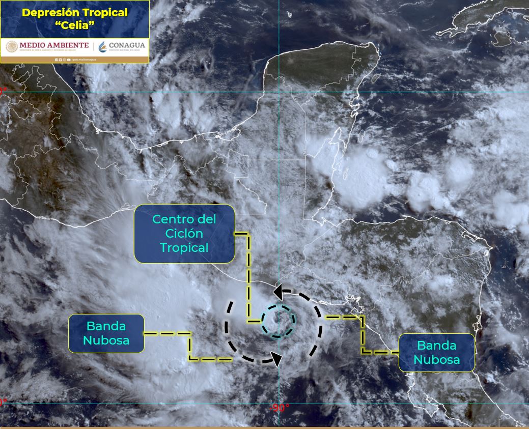 La amplia circulación de la Depresión Tropical “Celia” refuerza la probabilidad de lluvias muy fuertes a intensas sobre el sureste de México y la península de Yucatán, además de viento fuerte y oleaje elevado en el Golfo de Tehuantepec.