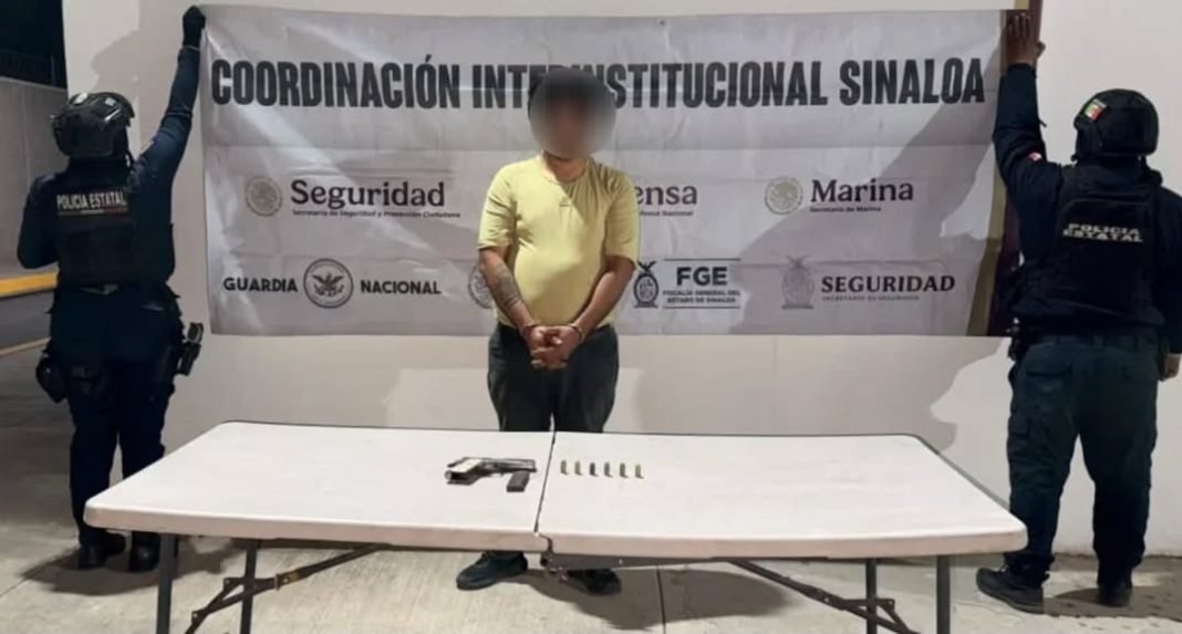 CULIACÁN, Sin.- Elementos de la Secretaría de Seguridad Pública del Estado, a través de la Policía Estatal Preventiva y en coordinación con el Ejército Mexicano, la Guardia Nacional, la Secretaría de Marina, la Secretaría de Seguridad y Protección Ciudadana, la Fiscalía General de la República y la Fiscalía General del Estado, detuvieron a un hombre y aseguraron un arma de fuego y municiones.