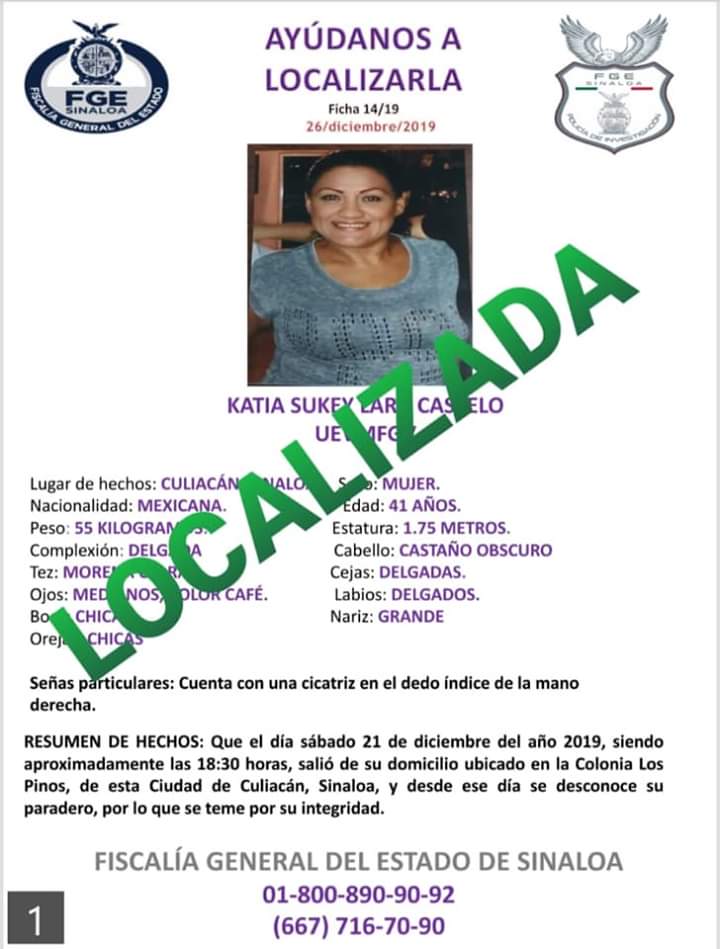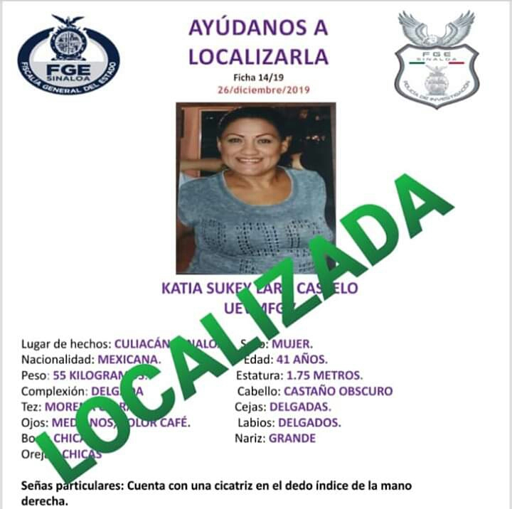 CULIACÁN, Sin.- Katia Sukey Lara Castelo, la mujer de 41 años de edad desaparecida desde el pasado sábado 21 de diciembre, ya fue localizada sin aclararse dónde y en qué condiciones.