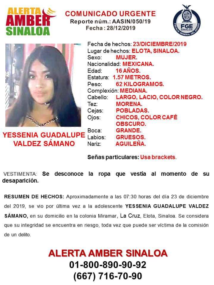 Aún falta por encontrar a la menor de 16 años de edad, Yessenia Guadalupe Valdez Sámano desaparecida el pasado 23 de diciembre en la colonia Miramar de La Cruz, en Elota.