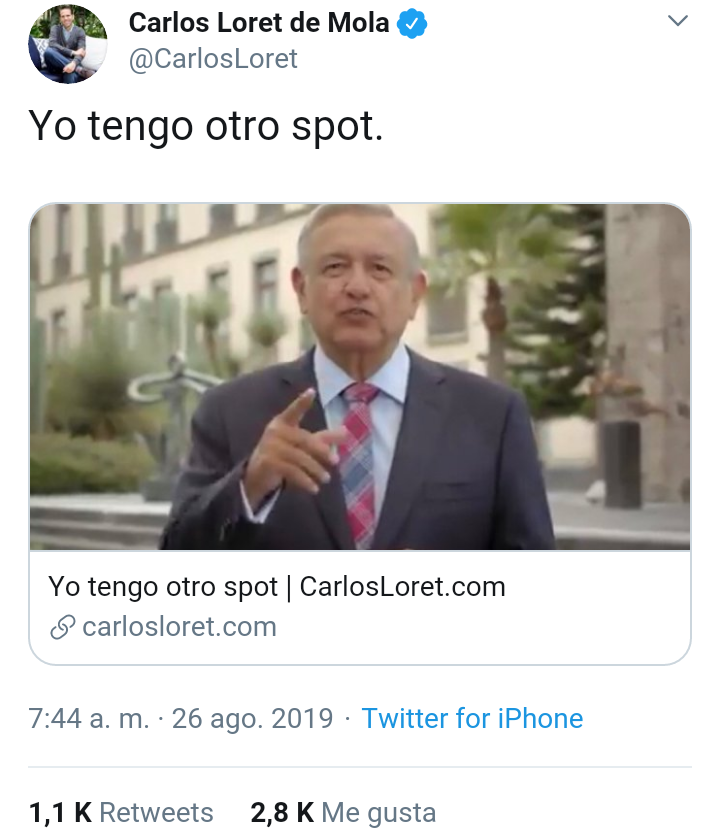 Grupo Televisa y Carlos Loret de Mola anunciaron el 22 de agosto el fin de su relación contractual luego de más de 20 años de trabajo conjunto. Tras el anuncio, en redes sociales se culpó al gobierno de AMLO de este hecho y de censura, lo cual negó.