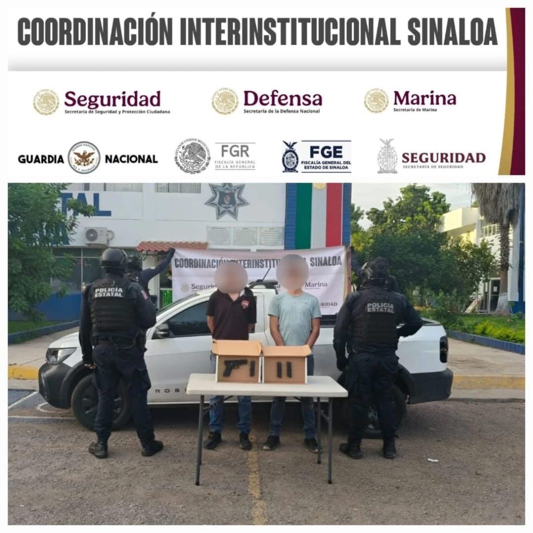 CULIACÁN, Sin.- Personal de la Secretaría de Seguridad Pública del Estado, a través de la Policía Estatal Preventiva, en coordinación con el Ejército Mexicano, la Guardia Nacional, la Secretaría de Marina, la Secretaría de Seguridad y Protección Ciudadana, la Fiscalía General de la República y la Fiscalía General del Estado, aseguraron en Culiacán a dos civiles en un vehículo, encontrando un arma, tres cargadores abastecidos y celulares.