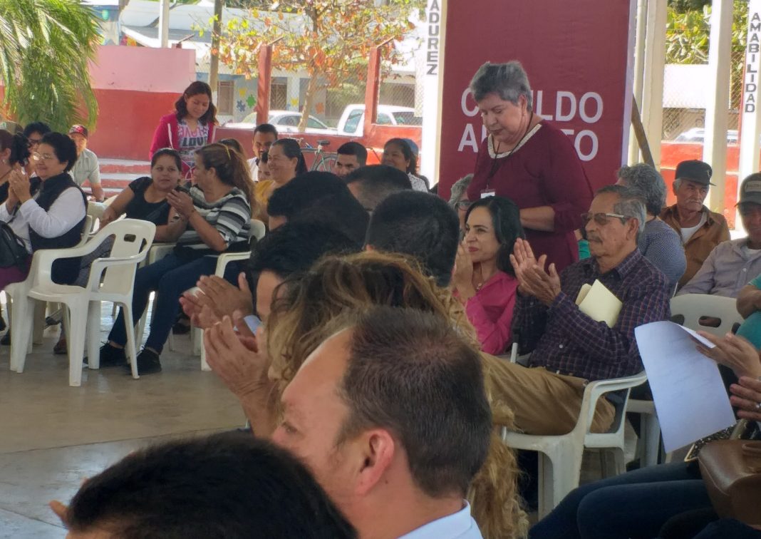 La maestra Vicky, como le conoce la comunidad escolar, en menos 3 minutos evidenció la necesidad más urgente del lugar sede del evento donde se dieron cita más de 100 ciudadanos.
