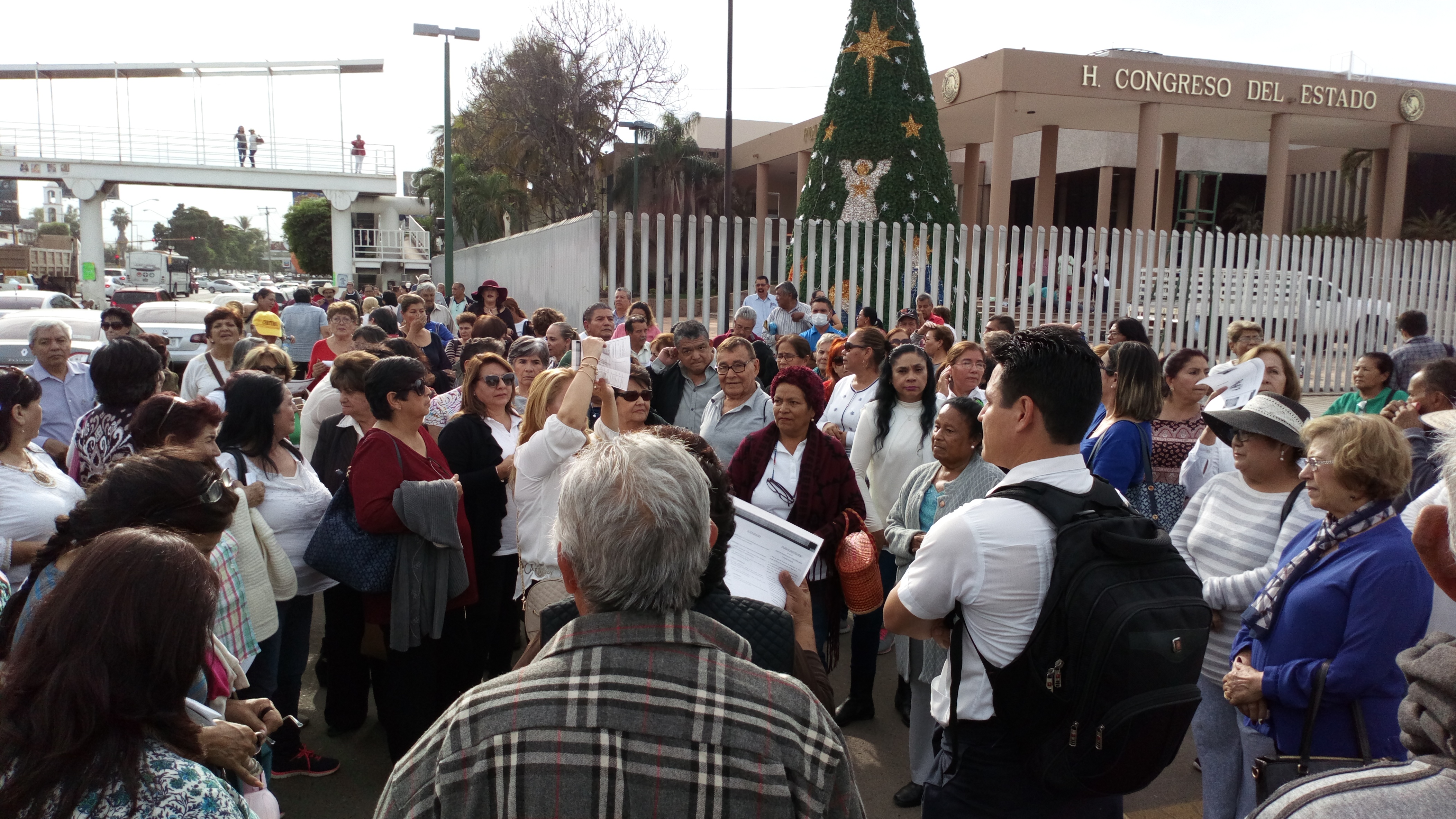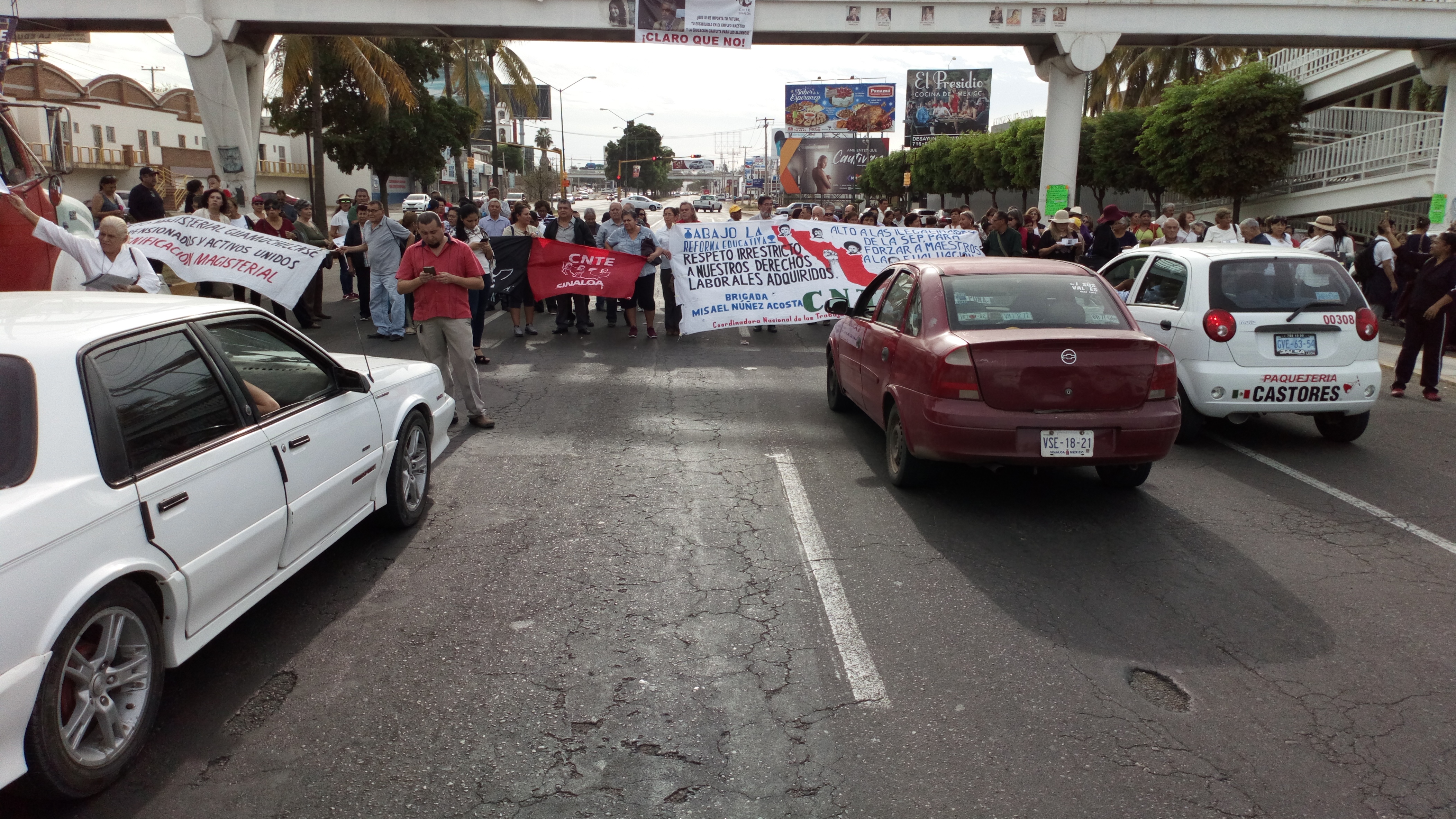 CULIACÁN, Sin.- Más de un centenar de maestros jubilados de la sección 27 agrupados en el Frente Democrático Herlinda Barrera Uicab provenientes de todo el estado cerraron por espacio de 10 minutos el paso a la circulación vial del bulevar Pedro Infante a la altura del Congreso del estado en reclamo del pago de aguinaldos.