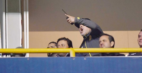 Maradona, técnico de Dorados, no pudo estar en el banquillo el domingo para ver el encuentro de vuelta de la final que su equipo disputó en el estadio Alfonso Lastras. El astro argentino debió permanecer en un palco, pues purgaba una suspensión tras ser expulsado en los últimos instantes del cotejo de ida.