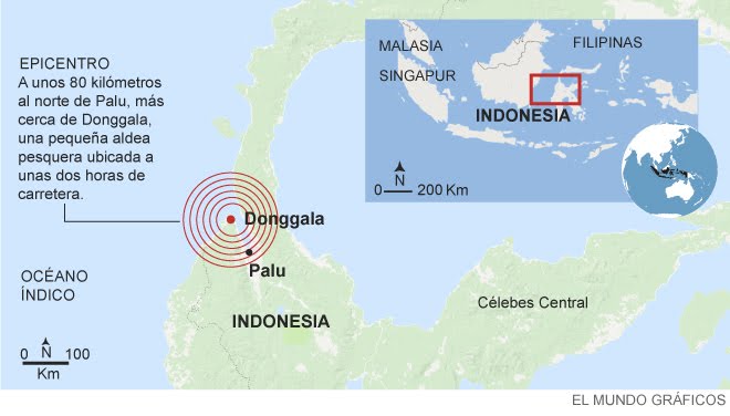 El epicentro del principal temblor se produjo a unos 80 kilómetros al norte de Palu, más cerca de Donggala, una pequeña aldea pesquera ubicada a unas dos horas de carretera que quedó totalmente incomunicada con el resto del territorio.