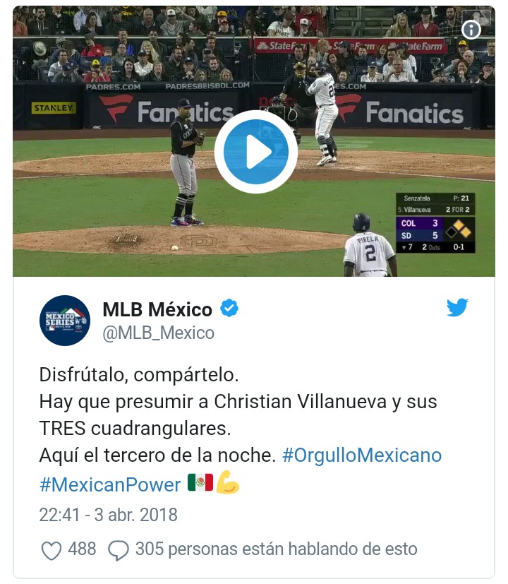 El mexicano Villanueva, de 26 años, se une a Hunter Renfroe como los únicos novatos de los Padres en jonronear en tres ocasiones en un mismo partido. Villanueva, el tercer jugador que comienza en la tercera base en los cinco juegos de San Siego esta temporada, es el séptimo jugador del equipo en conectar tres cuadrangulares.